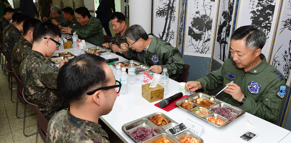 새누리당 김희옥 비상대책위원장과 정진석 원내대표 등 원내지도부들이 15일 경기도 오산 공군작전사령부에 방문, 이왕근 공군 작전사령관을 비롯한 장병들과 함께 점심식사를 하고 있다.