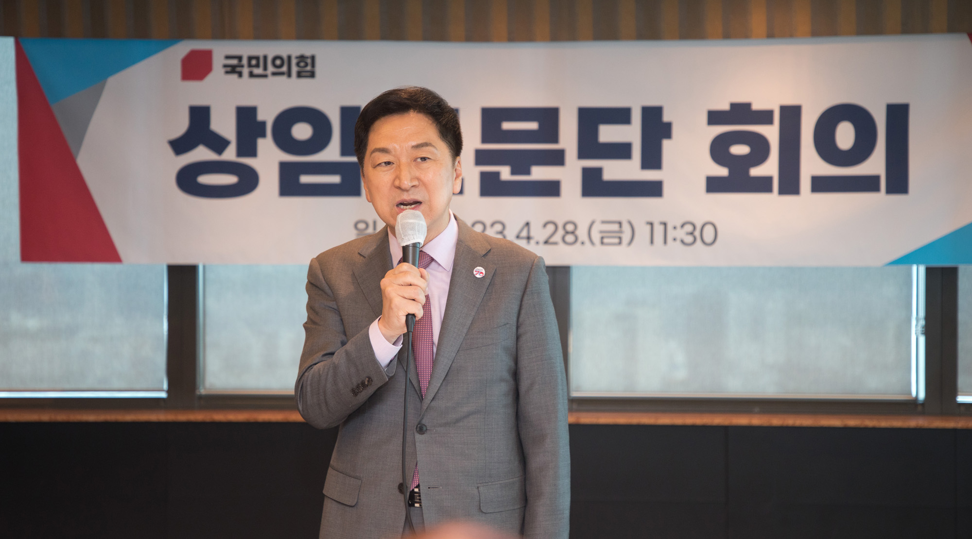 28일 오전 서울 여의도의 한 식당에서 열린 국민의힘 상임고문단 회의에서 김기현 대표가 인사말을 하고 있다.