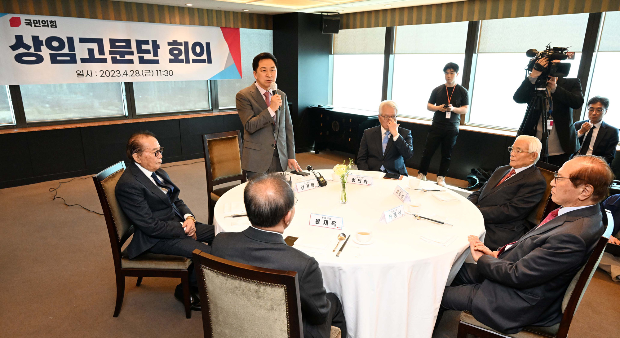 김기현 국민의힘 대표가 28일 서울 여의도의 한 식당에서 열린 국민의힘 상임고문단 회의에서 발언하고 있다.