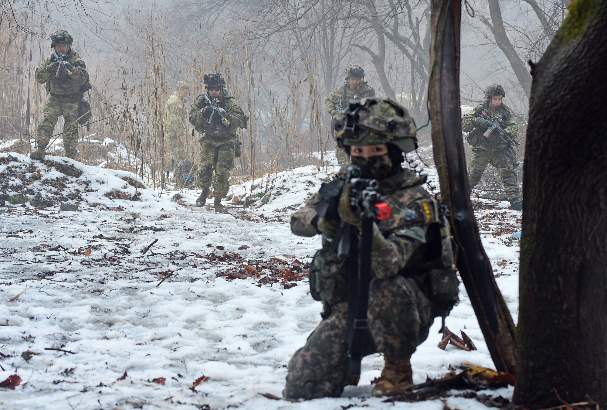 13일 경기 파주 무건리 훈련장에서 열린 아미타이거 시범여단 연합훈련에서 한미 장병들이 분소대 공격방어 훈련을 하고 있다. /사진공동취재단