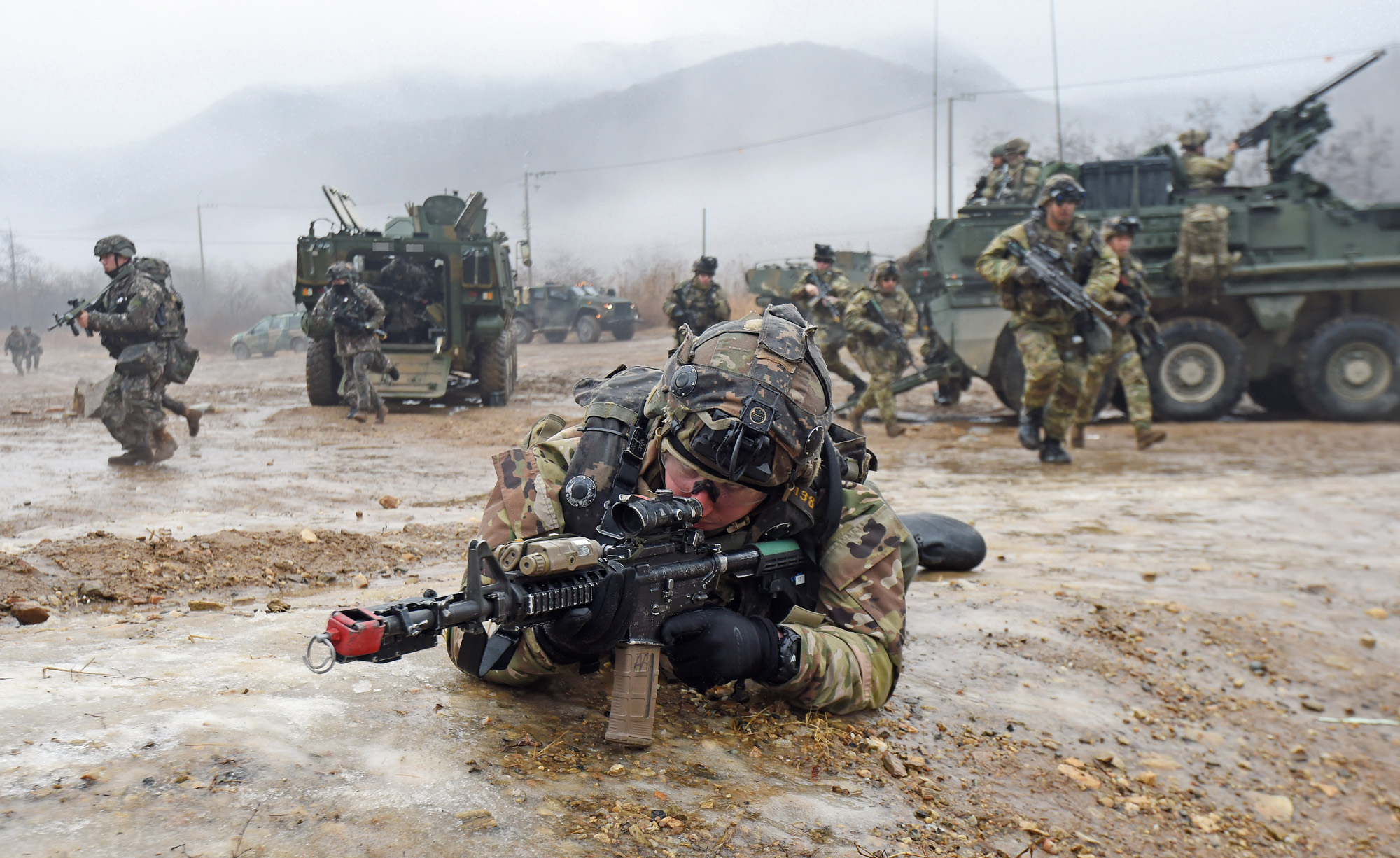 13일 경기 파주 무건리 훈련장에서 열린 아미타이거 시범여단 연합훈련에서 한미 장병들이 분소대 공격방어 훈련을 하고 있다. /사진공동취재단