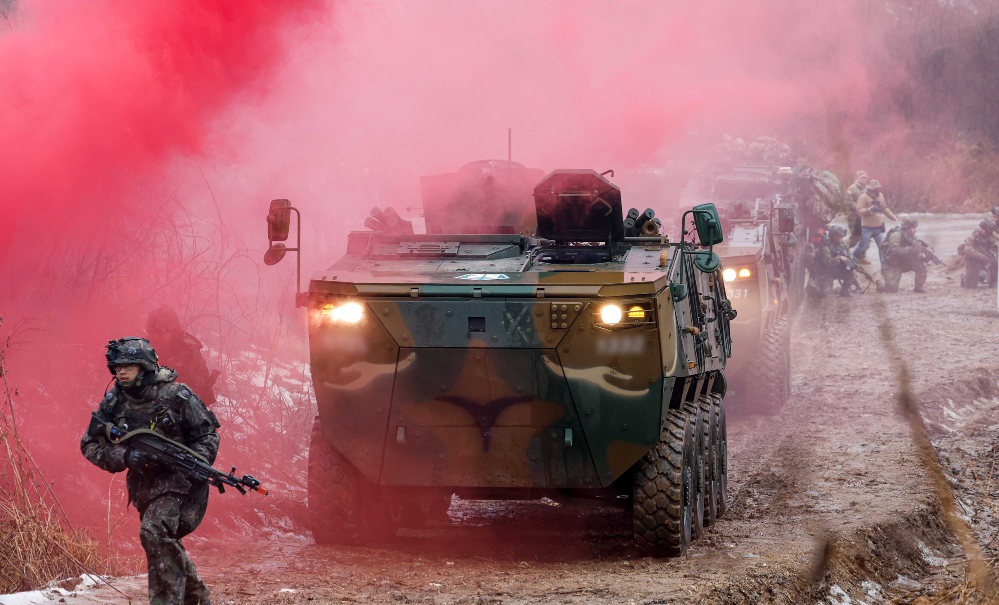| 사진설명 | 13일 경기 파주 무건리훈련장에서 육군 아미타이거 시범여단과 미2사단 스트라이커여단이 대대급 연합훈련을 실시하고 있다. 이번 훈련에는 한미 장병 800여 명과 K808차륜형장갑차, 미 스트라이커장갑차, 정찰드론, 무인항공기(UAV), 대전차미사일(현궁) 등 다양한 무기체계가 투입됐다./2023.01.13 사진공동취재단 |