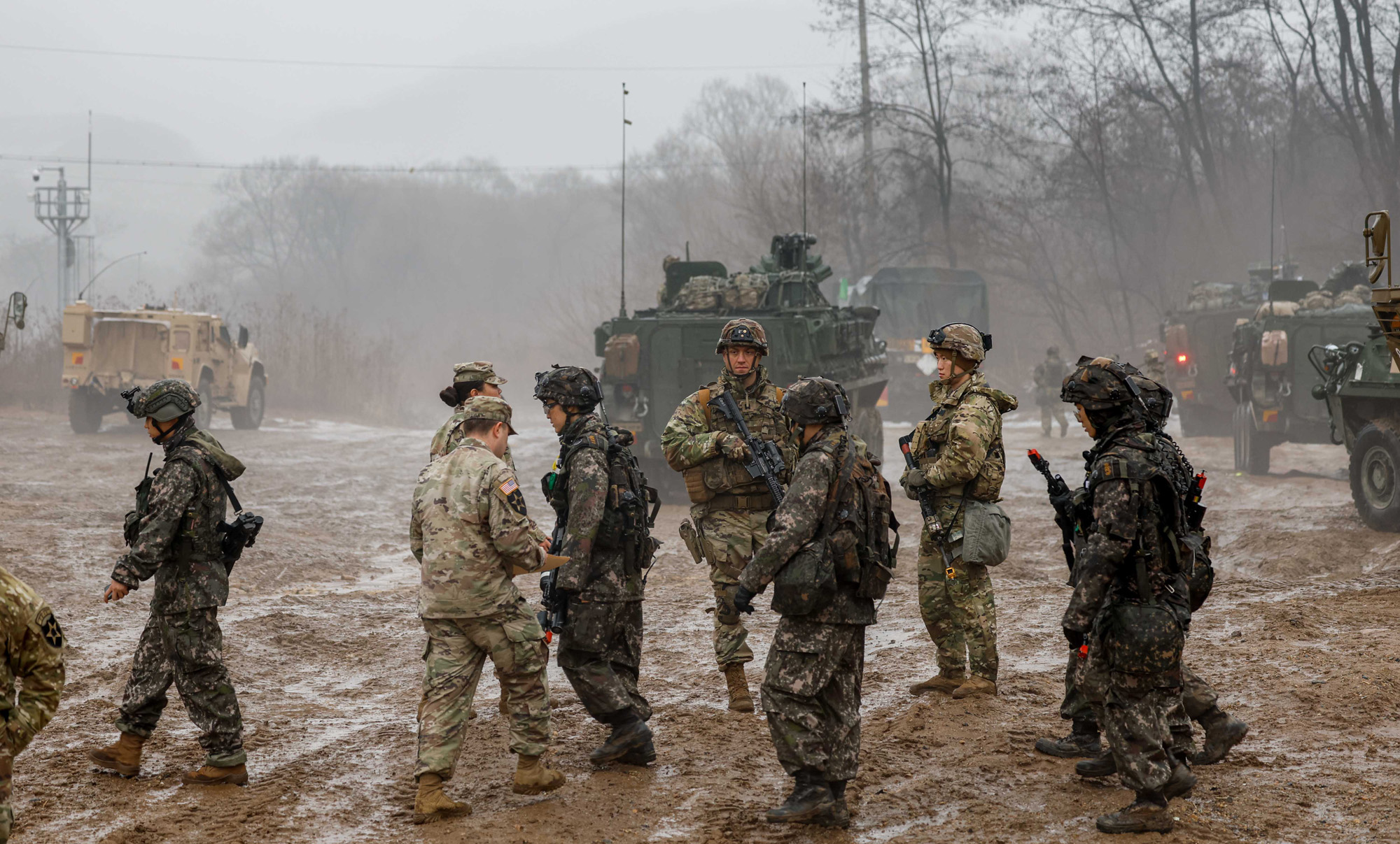 | 사진설명 | 13일 경기 파주 무건리훈련장에서 육군 아미타이거 시범여단과 미2사단 스트라이커여단이 대대급 연합훈련을 실시하고 있다. 이번 훈련에는 한미 장병 800여 명과 K808차륜형장갑차, 미 스트라이커장갑차, 정찰드론, 무인항공기(UAV), 대전차미사일(현궁) 등 다양한 무기체계가 투입됐다./2023.01.13 사진공동취재단 |