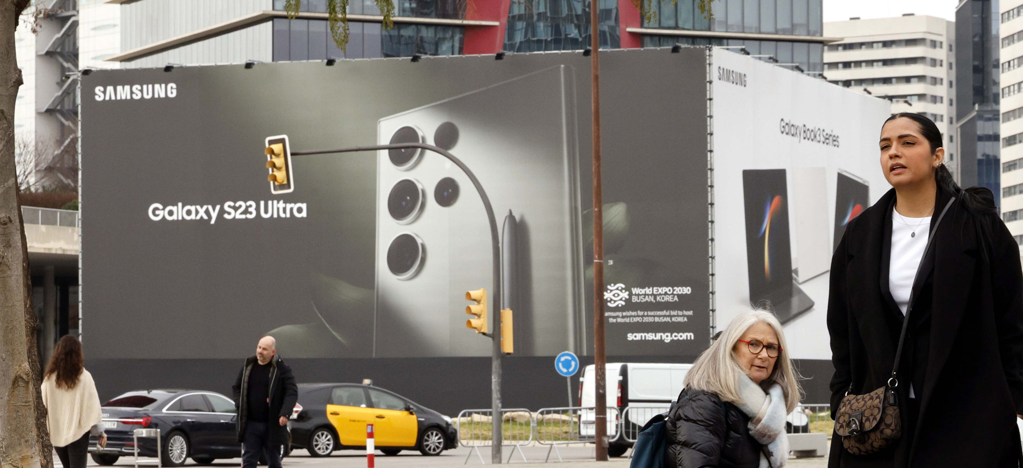 모바일 월드 콩그레스(MWC 2023)’ 개막을 앞둔 25일(현지시간) 스페인 바르셀로나 피라 그란 비아 전시장 앞에 삼성전자의 갤러시23의 대형 광고판이 붙어있다. 세계 최대 모바일 기술 박람회인 MWC는 오는 27일 개막해 다음달 2일까지 나흘간 열린다. 바르셀로나=사진공동취재단 |
