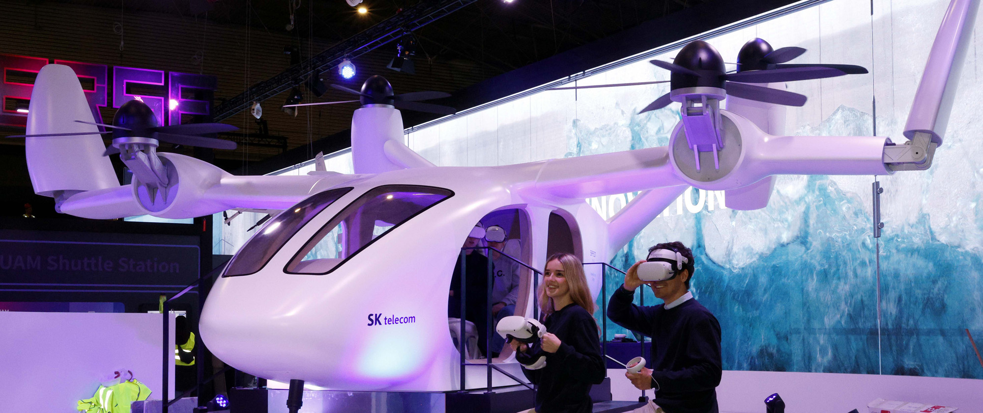 모바일 월드 콩그레스(MWC 2023)’ 개막을 앞둔 25일(현지시간) 스페인 바르셀로나 피라 그란 비아 전시장 내 설치된 SK텔레콤 전시관에서 현지 관계자들이 조비 에비에이션의 기체를 기반으로 제작한 실물 크기의 도심항공교통(UAM,Urban Air Mobility) 모형을 체험하고있다. 세계 최대 모바일 기술 박람회인 MWC는 오는 27일 개막해 다음달 2일까지 나흘간 열린다. 바르셀로나=사진공동취재단 |