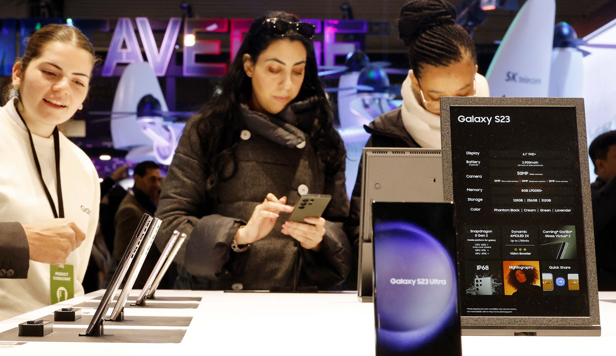28일(현지시각) 스페인 바르셀로나 피라 그란 비아에 설치된 삼성전자의 부스에서 관람객들이 갤럭시 S23울트라 스마트폰을 살펴보고 있다.