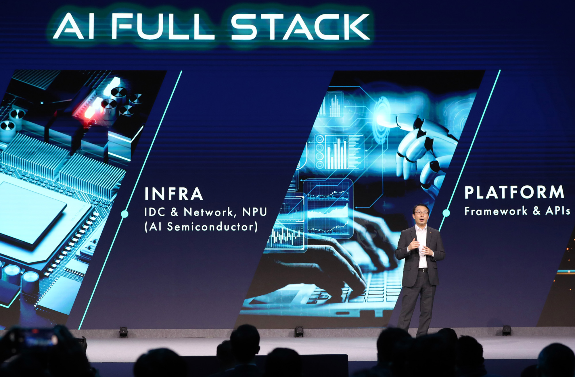 MWC/ KT 구현모 대표 키노트 스피치 28일 오후(현지시간) 구현모 KT 대표가 스페인 바르셀로나 피라 그란 비아 전시장에서 열린 세계 최대 이동통신 전시회 '모바일월드콩그레스'(MWC 2023)에서 '협업(Co-Creation)을 위한 시간인가?'를 주제로 기조연설을 하고 있다. 2023.2.28/사진공동취재단 |