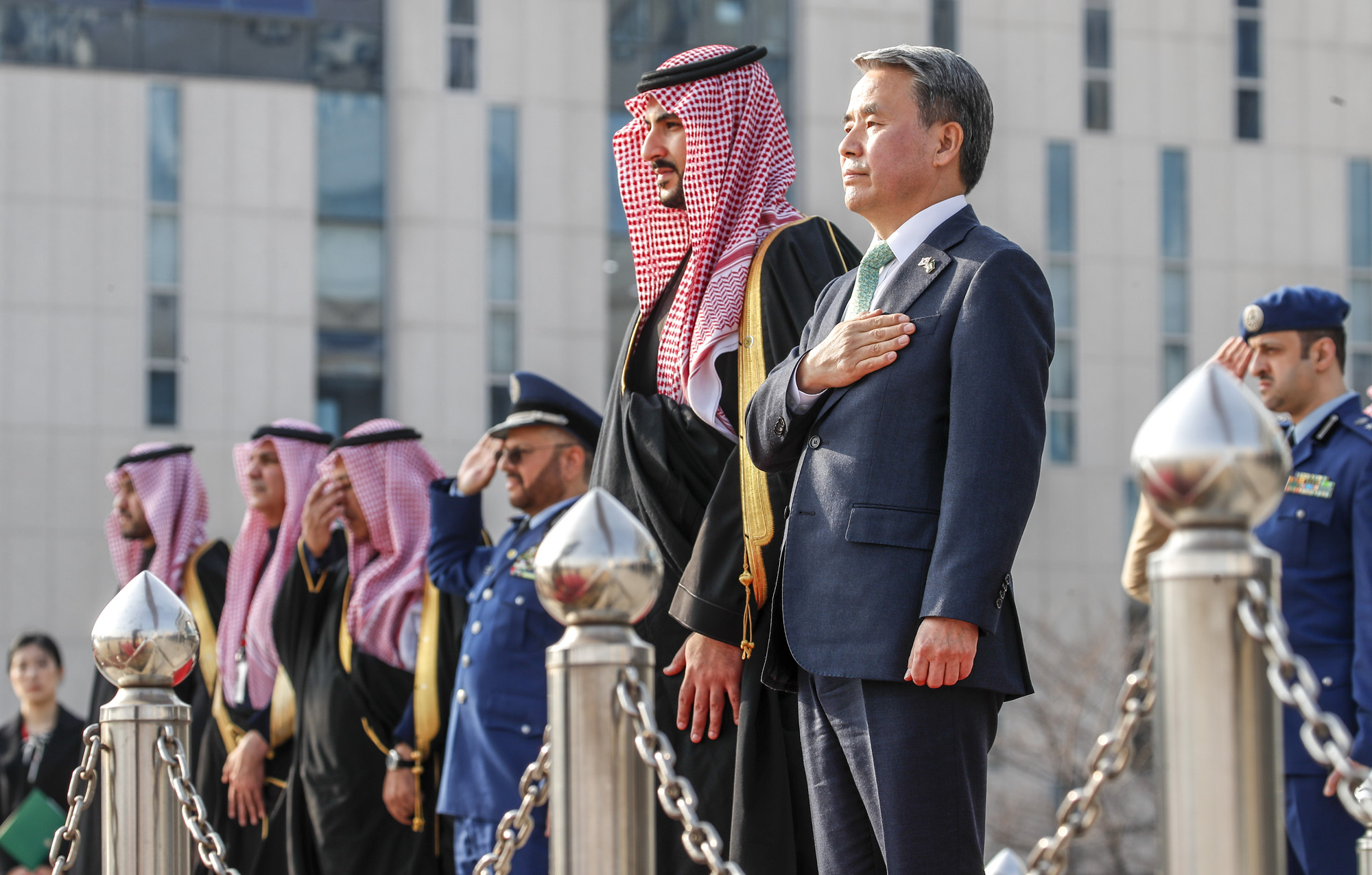 이종섭 국방부 장관과 칼리드 빈 살만 알 사우드 사우디아라비아 국방부 장관이 7일 오후 서울 용산구 국방부 연병장에서 열린 환영 의장 행사에서 국민의례를 하고 있다. 2023.03.07.