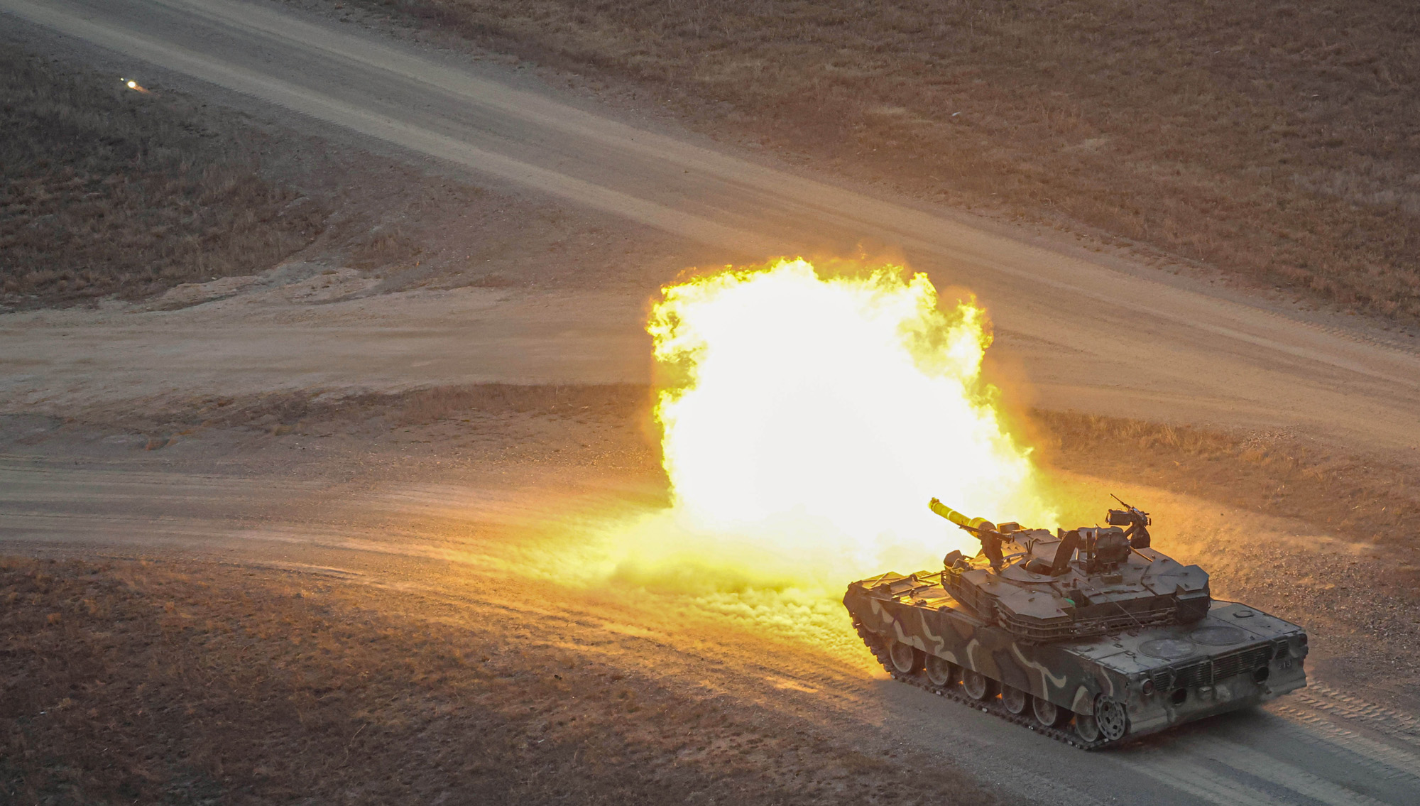 22일 오후 경기도 포천시 로드리게스 훈련장에서 열린 한미 연합 제병협동사격 훈련에서 육군 수도기계화보병사단 소속 K1A2 전차가 표적을 향해 사격하고 있다. 2023.03.22 사진공동취재단
