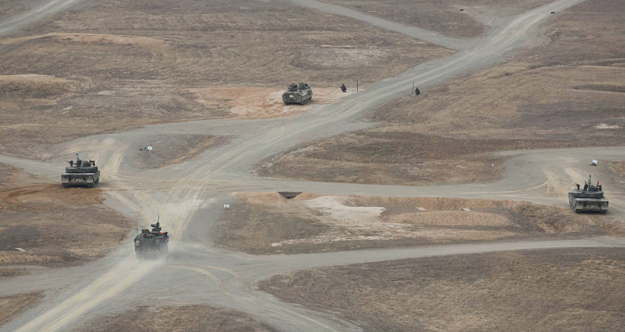 22일 오후 경기도 포천시 로드리게스 훈련장에서 열린 한미 연합 제병협동사격 훈련에서 K1A2 전차를 비롯한 육군 수도기계화보병사단 기갑 차량들과 미2사단 예하 스트라이커 여단 소속 장갑차들이 기동 훈련을 하고 있다. 2023.03.22 사진공동취재단