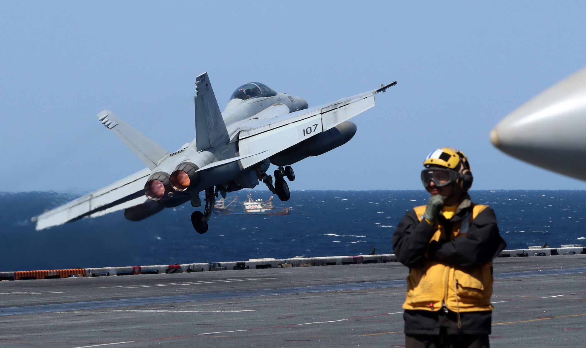 | 사진설명 | 한미 해군 연합 해상훈련이 열린 27일 제주 남쪽 공해상에 진입한 미 핵추진 항공모함 '니미츠'(CVN 68·10만t급)에서 F/A-18F 슈퍼호넷 이함 훈련이 진행되고 있다. 길이 332.8m, 폭 76.8m, 승조원 5500~6000명 규모인 니미츠함은 F/A-18F 슈퍼호넷 등 전투기와 E-2C 호크아이 조기경보기, 수송기, 헬기 등 각종 항공기 90여 대을 탑재할 수 있는 것으로 알려졌다. |