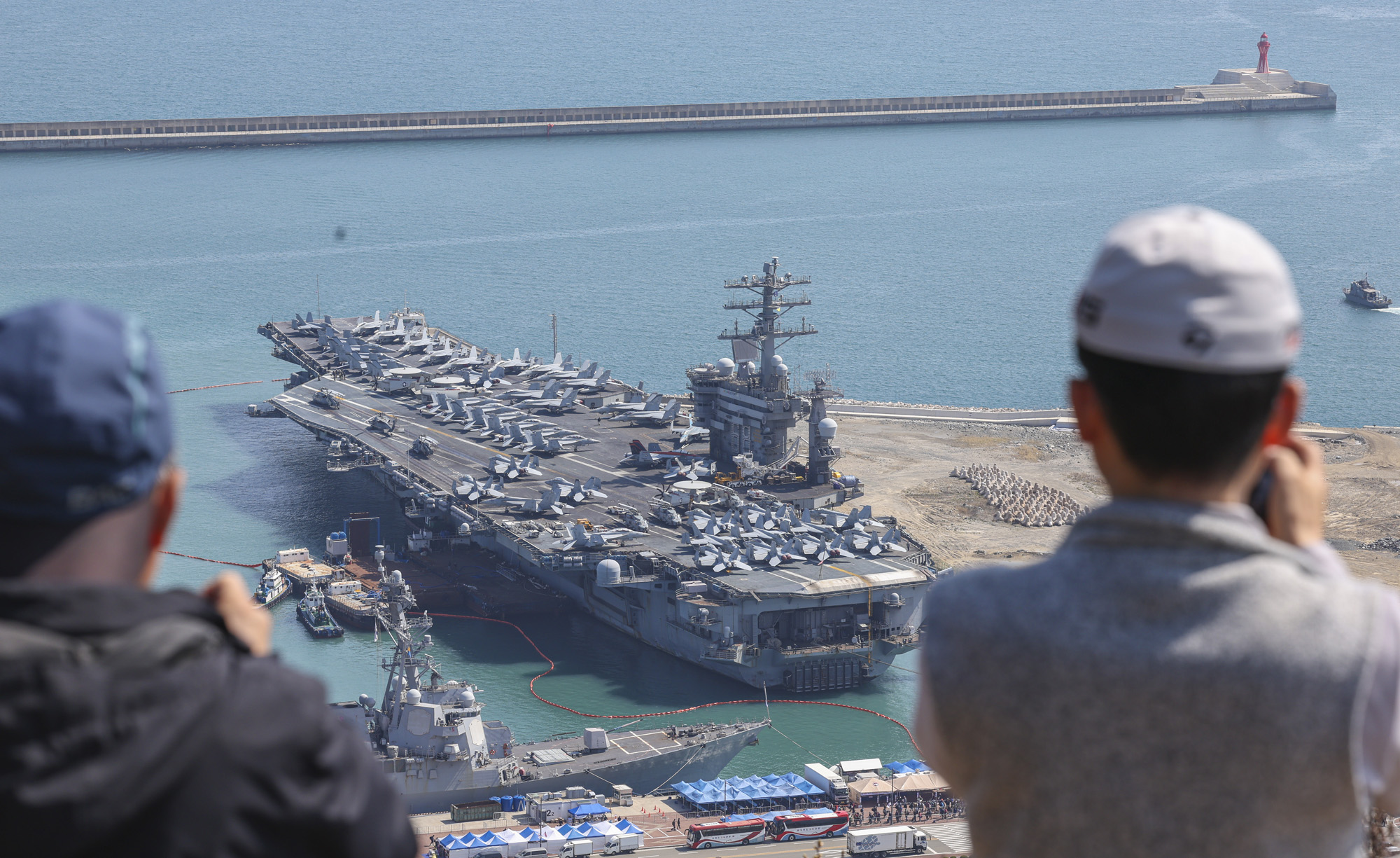 28일 부산 작전기지에 미 핵 추진 항공모함 니미츠(CVN-68)가 입항해 있다. 니미츠호를 포함한 미 제11항모강습단은 전날 제주 남방 공해상에서 해군과 연합해상훈련을 펼쳤다. 사진공동취재단