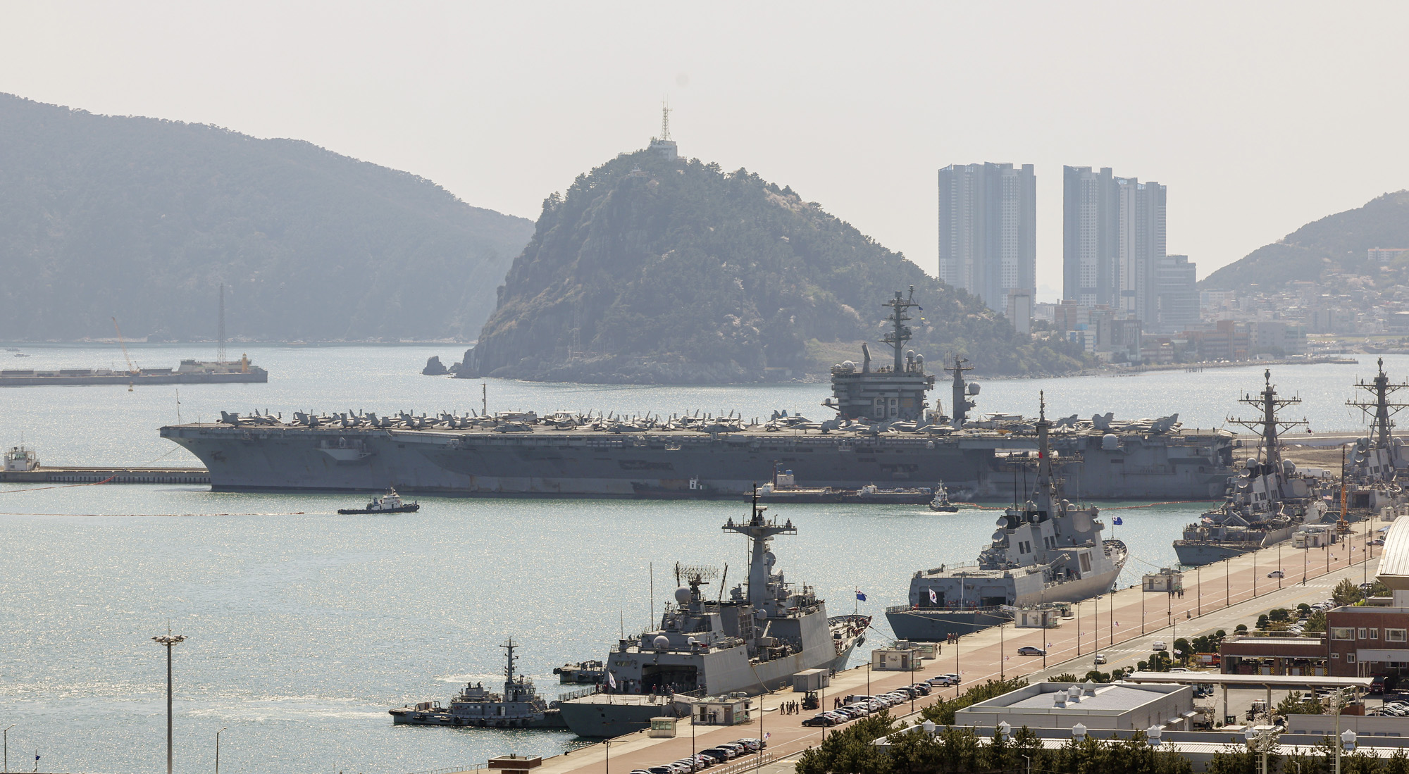 28일 부산 작전기지에 미 핵 추진 항공모함 니미츠(CVN-68)가 입항해 있다. 니미츠호를 포함한 미 제11항모강습단은 전날 제주 남방 공해상에서 해군과 연합해상훈련을 펼쳤다. 사진공동취재단