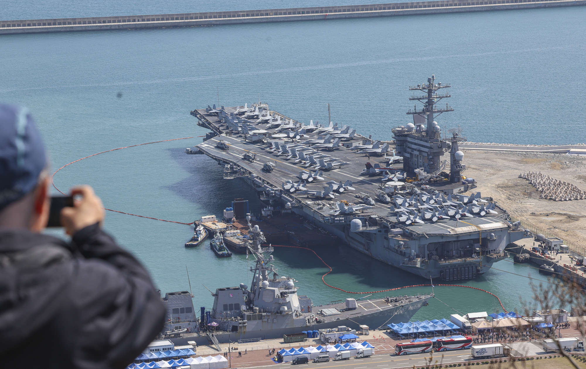28일 부산 작전기지에 미 핵 추진 항공모함 니미츠(CVN-68)가 입항해 있다. 니미츠호를 포함한 미 제11항모강습단은 전날 제주 남방 공해상에서 해군과 연합해상훈련을 펼쳤다. 사진공동취재단