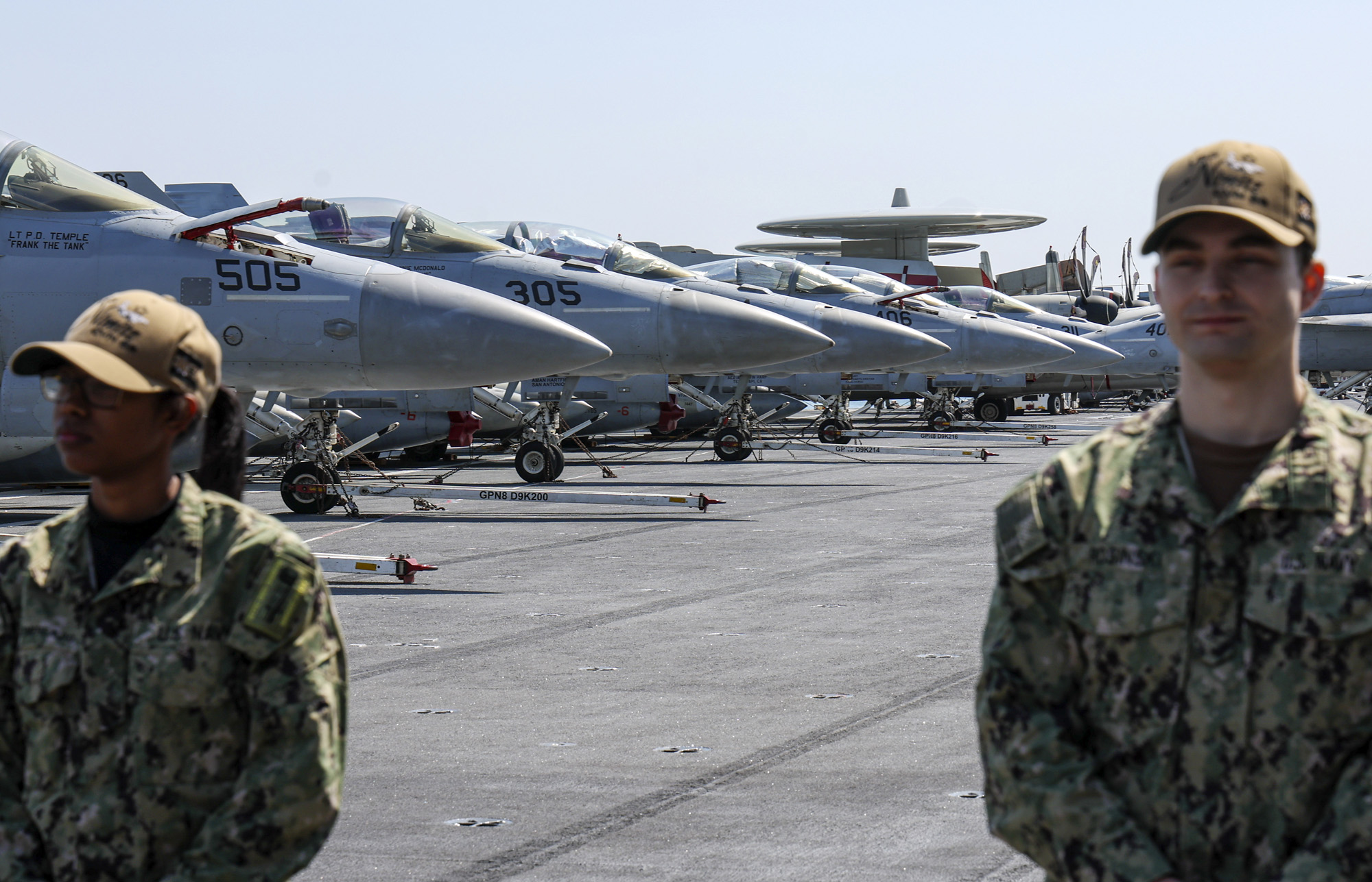 28일 부산 작전기지에 입항한 미국 핵 추진 항공모함 니미츠(CVN-68) 갑판에 F/A-18 전투공격기를 비롯한 항공기들이 서 있다. 사진공동취재단