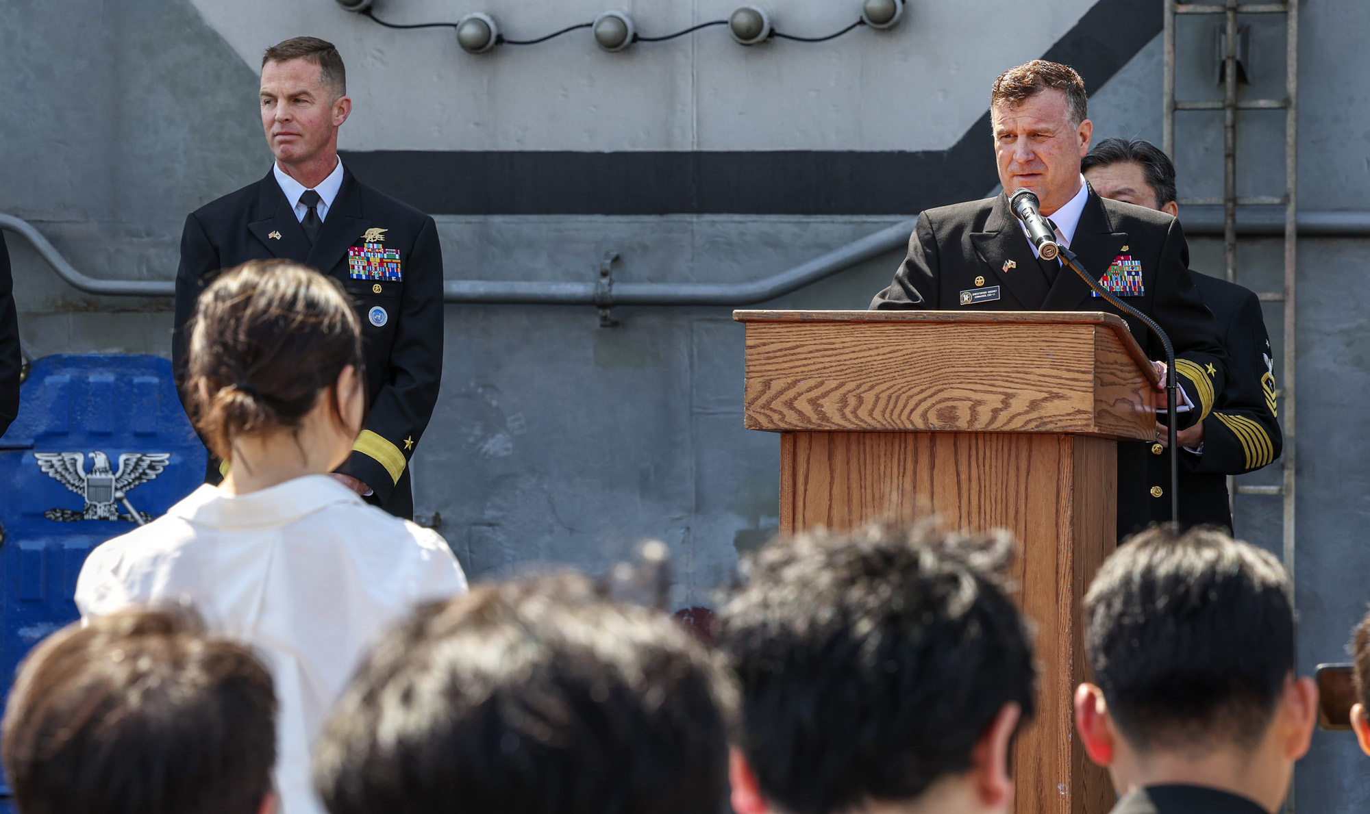 28일 부산 작전기지에 입항한 미국 핵 추진 항공모함 니미츠(CVN-68) 갑판에서 열린 한미 기자회견에 미 제11항모강습단 크리스토퍼 스위니 단장이 발언하고 있다. 사진공동취재단