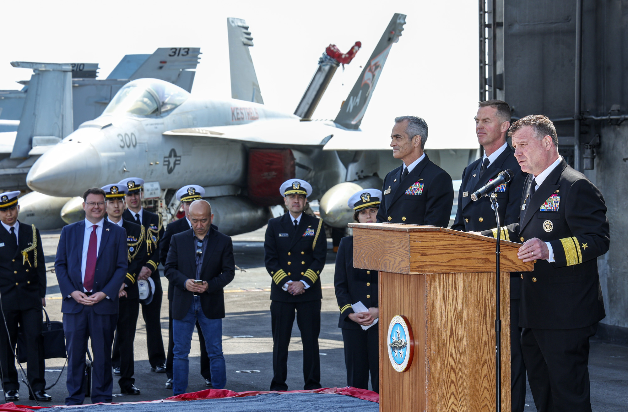 28일 부산 작전기지에 입항한 미국 핵 추진 항공모함 니미츠(CVN-68) 갑판에서 열린 한미 기자회견에 미 제11항모강습단 크리스토퍼 스위니 단장이 발언하고 있다. 사진공동취재단