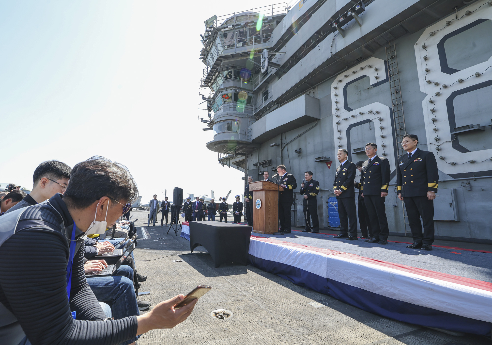 28일 부산 작전기지에 입항한 미국 핵 추진 항공모함 니미츠(CVN-68) 갑판에서 한미 기자회견이 진행되고 있다. 사진공동취재단