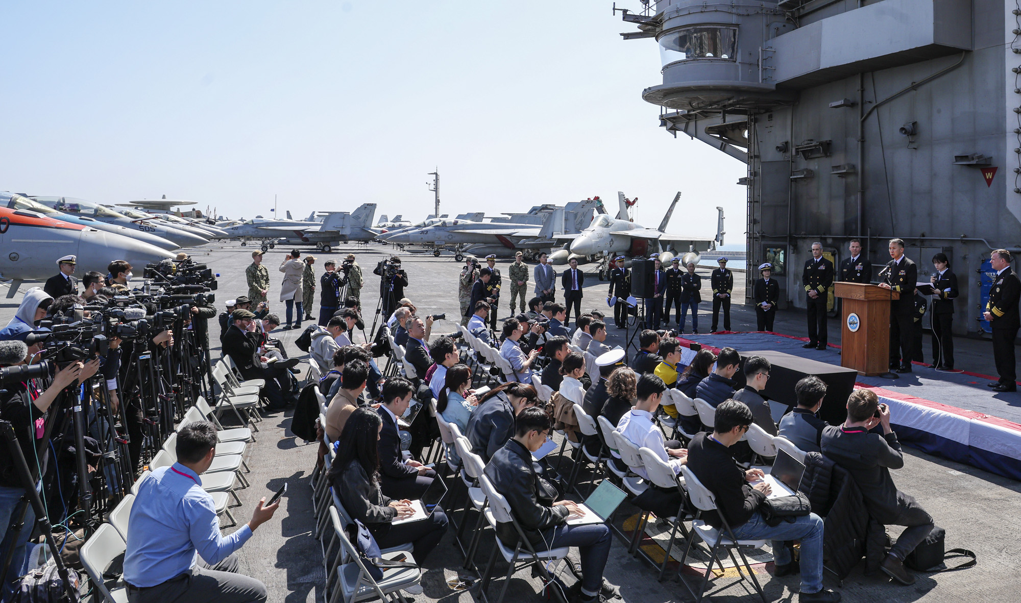 28일 부산 작전기지에 입항한 미국 핵 추진 항공모함 니미츠(CVN-68) 갑판에서 한미 기자회견이 진행되고 있다. 사진공동취재단