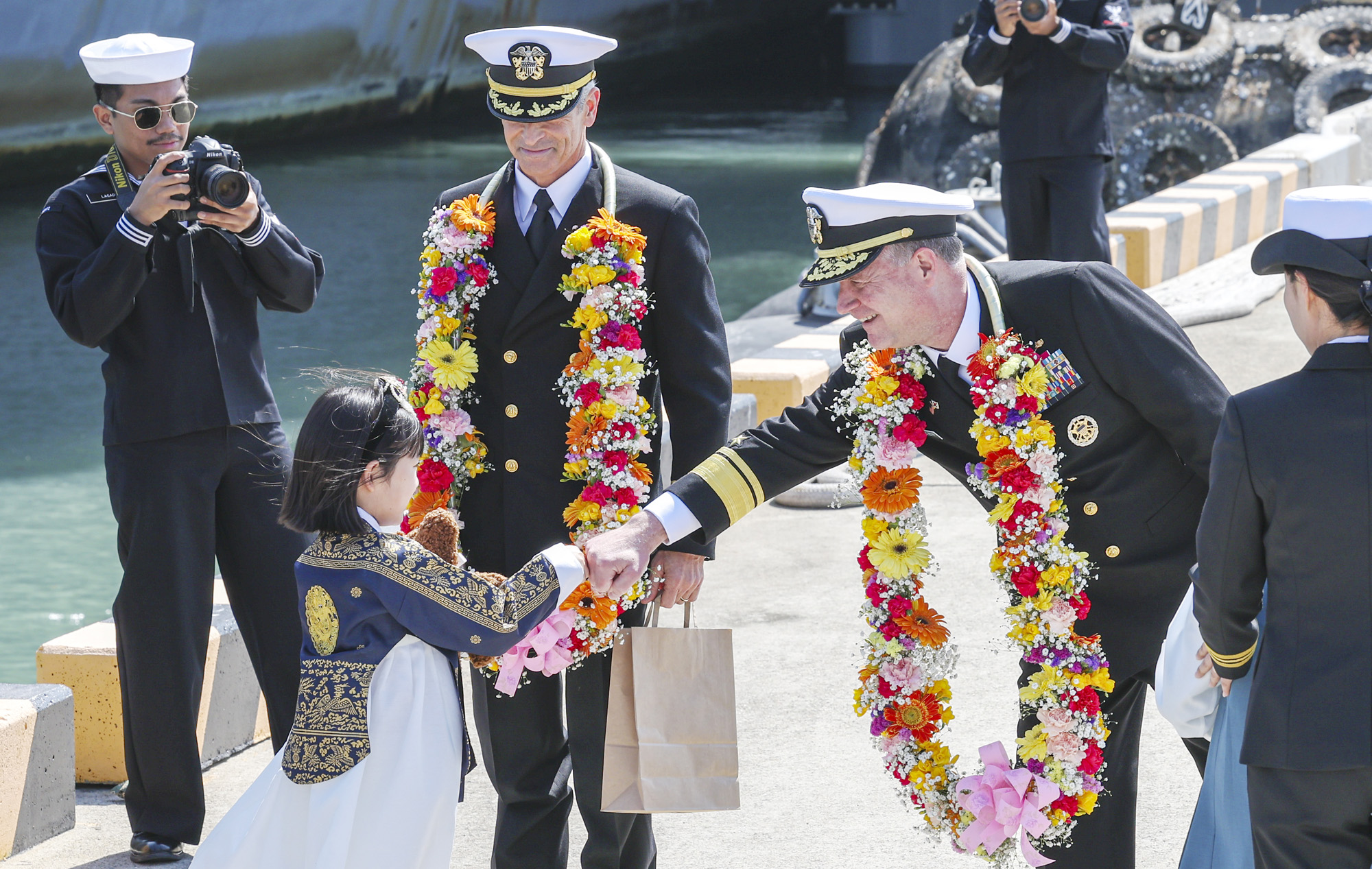 28일 부산 작전기지에 미국 핵 추진 항공모함 니미츠(CVN-68)가 입항해 미 제11항모강습단 크리스토퍼 스위니 단장이 화동과 인사를 나누고 있다. 사진공동취재단