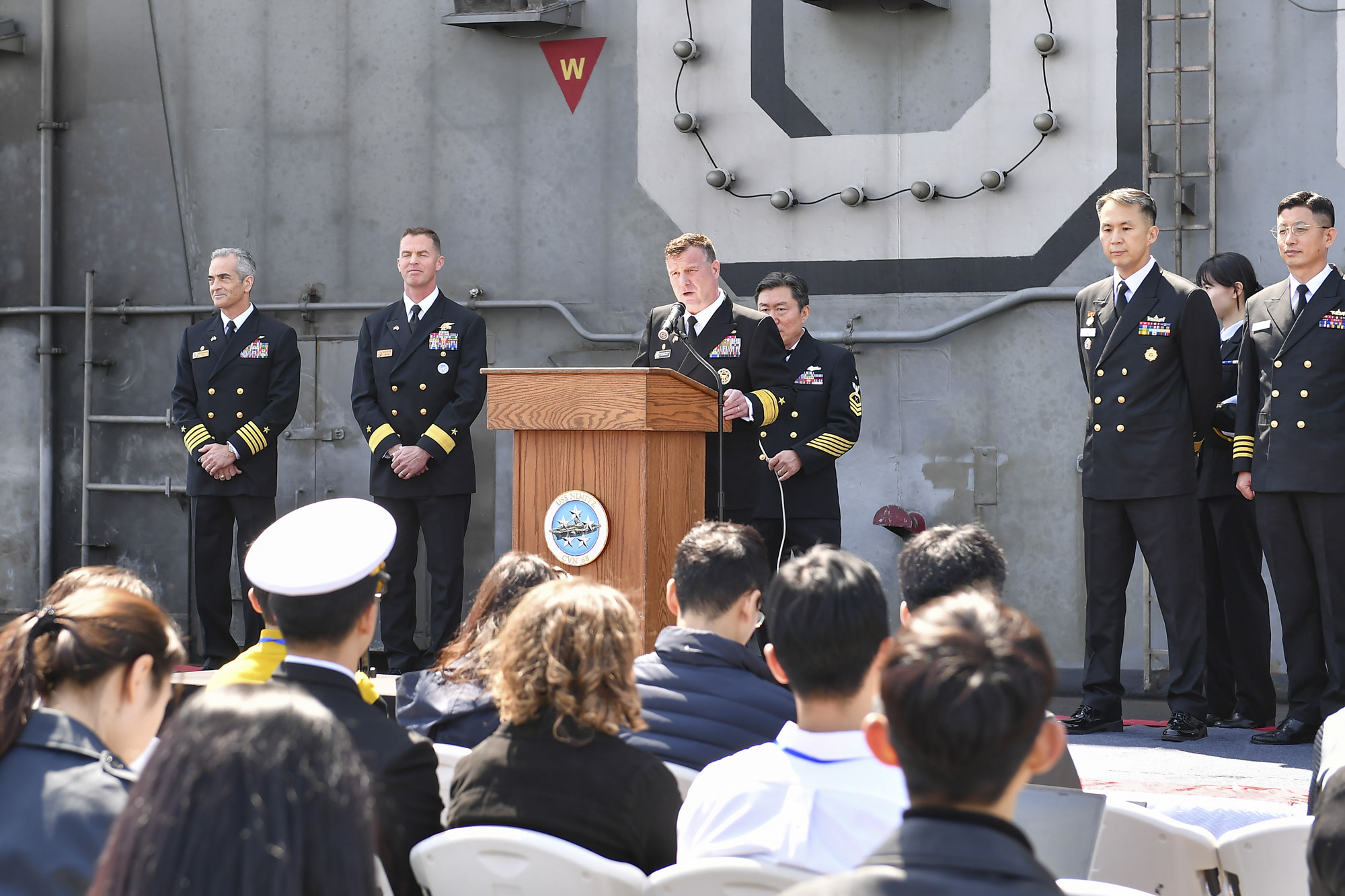 함상에서 크리스토퍼 스위니(소장) 11항모강습단장이 기자의 질의에 대한 답변을 하고 있다.