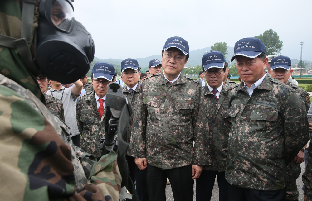 정진석 새누리당 원내대표를 비롯한 의원들이 24일 경기도 의정부 미2사단 한미연합사단을 방문, 화학전 장비를 살펴보고 있다. 2016.6.24