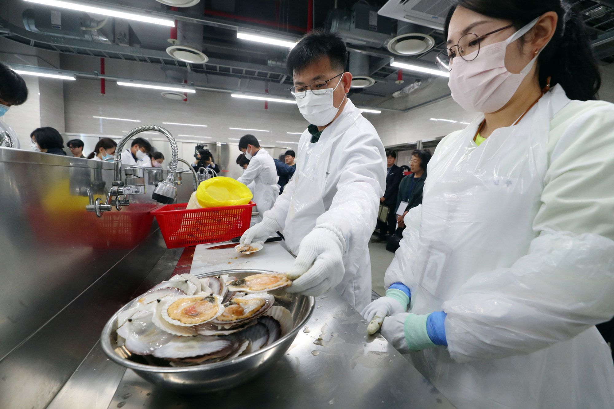 25일 오후 부산 연제구 부산식약청 실험실에서 일반시민,급식관련업체 관계자 등이 참관하는 가운데 식약처 직원들이 일본산 활가리비에 대한 방사능 검사를 하고 있다.2023.05.25 사진공동취재단