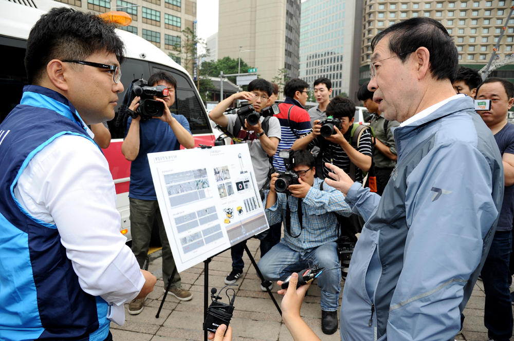 박원순 서울시장이 20일 오전 서울 중구 세종대로 서울역 교차로 인근에서 '동공탐사 및 포트홀 신고시스템 운용 현장점검'에 나서 작업현장을 살펴보고 있다. 서울시 제공