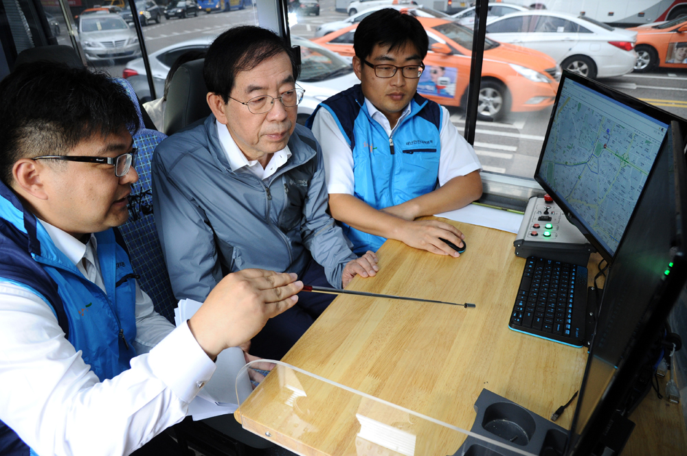 박원순 서울시장이 20일 오전 서울 중구 세종대로 서울역 교차로 인근에서 '동공탐사 및 포트홀 신고시스템 운용 현장점검'에 나서 작업현장을 살펴보고 있다. 서울시 제공