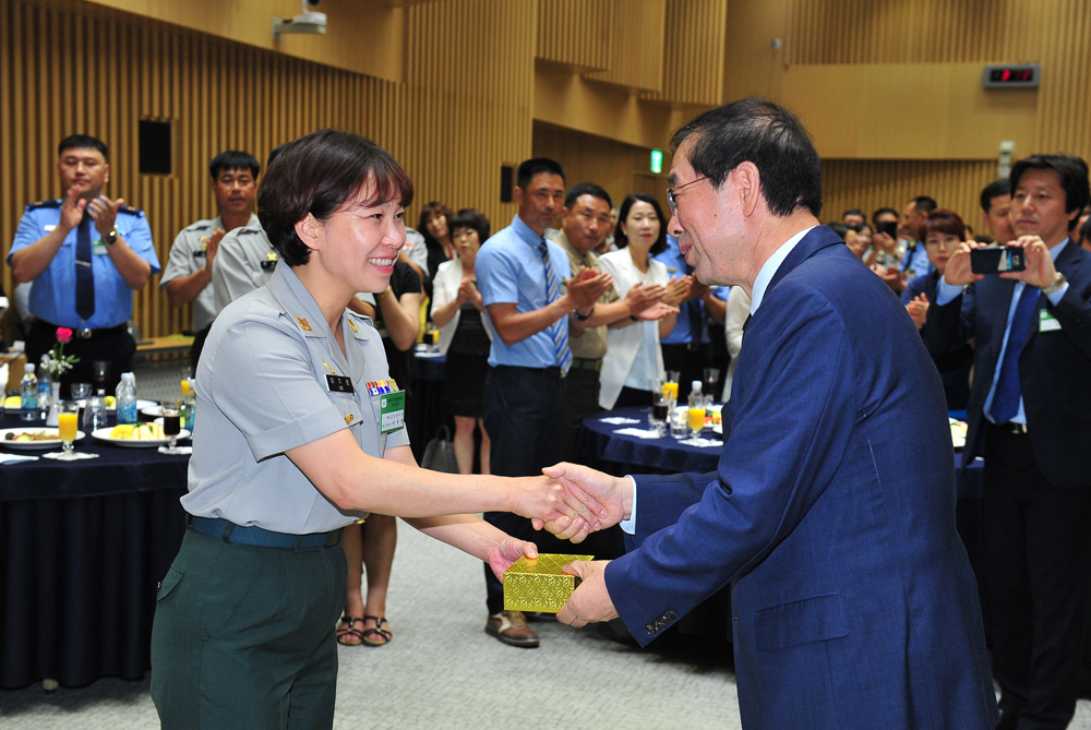 박원순 서울시장이 21일 오후 모범적인 임무수행을 통해 국군모범용사로 선발된 현역 부사관 내외 120명을 서울 중구 시청으로 초청해 격려를 하고 있다. 서울시 제공