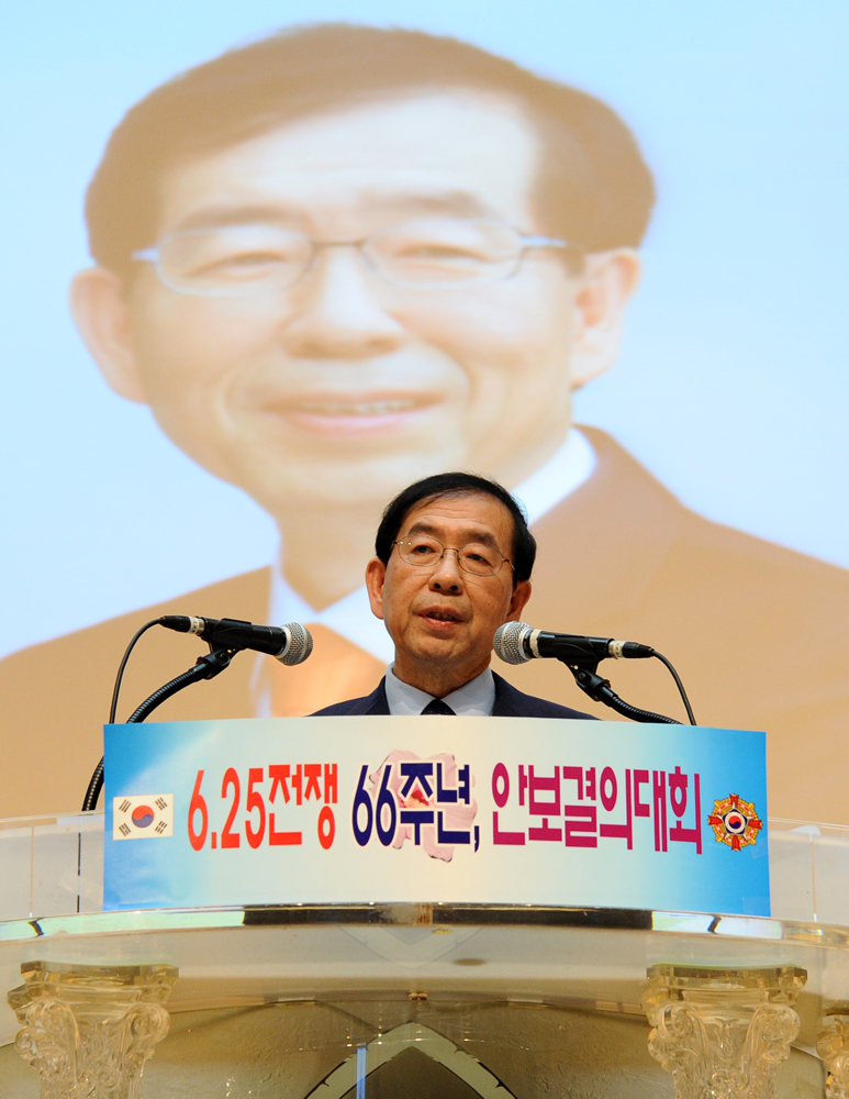 박원순 서울시장이 24일 서울 종로구 한국교회 100주년 기념관에서 열린 '6.25전쟁 안보결의대회'에 참석해 인사하고 있다. 서울시 제공