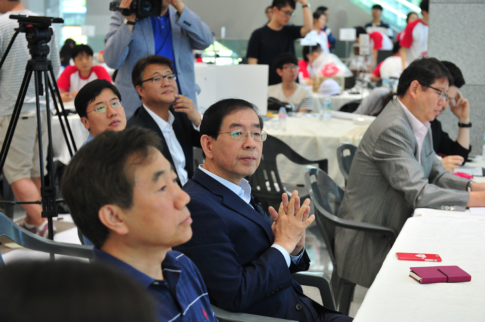 박원순 서울시장이 26일 오후 서울 상암동 에스플렉스에서 열린 아이디어 마라톤 'I·해커톤·U'에서 한 복지분야 참가팀의 프리젠테이션을 보며 심사를 하고 있다. 서울시 제공