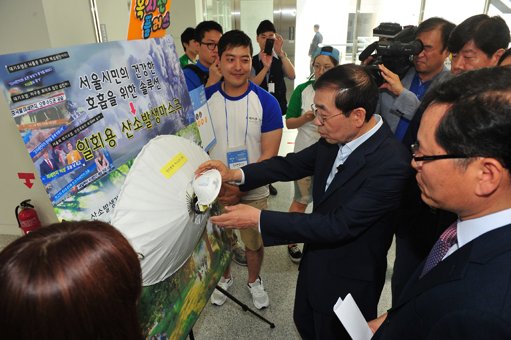 박원순 서울시장이 26일 오후 서울 상암동 에스플렉스에서 열린 아이디어 마라톤 'I·해커톤·U'에서 한 복지분야 참가팀의 프리젠테이션을 보며 심사를 하고 있다. 서울시 제공