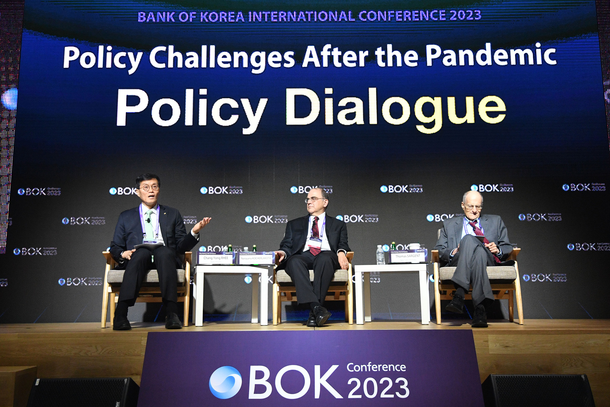 | 사진설명 | 이창용 한국은행 총재가 1일 오전 서울 중구 한국은행 별관에서 '팬데믹 이후의 정책과제(Policy Challenges After the Pandemic)'라는 주제로 열린 2023년 BOK 국제컨퍼런스에 참석해 정책 대담을 하고 있다. 왼쪽부터 이창용 한국은행 총재, 나라야나 코처라코타 교수, 토마스 사전트 교수. 2023.06.01. 사진공동취재단 |
