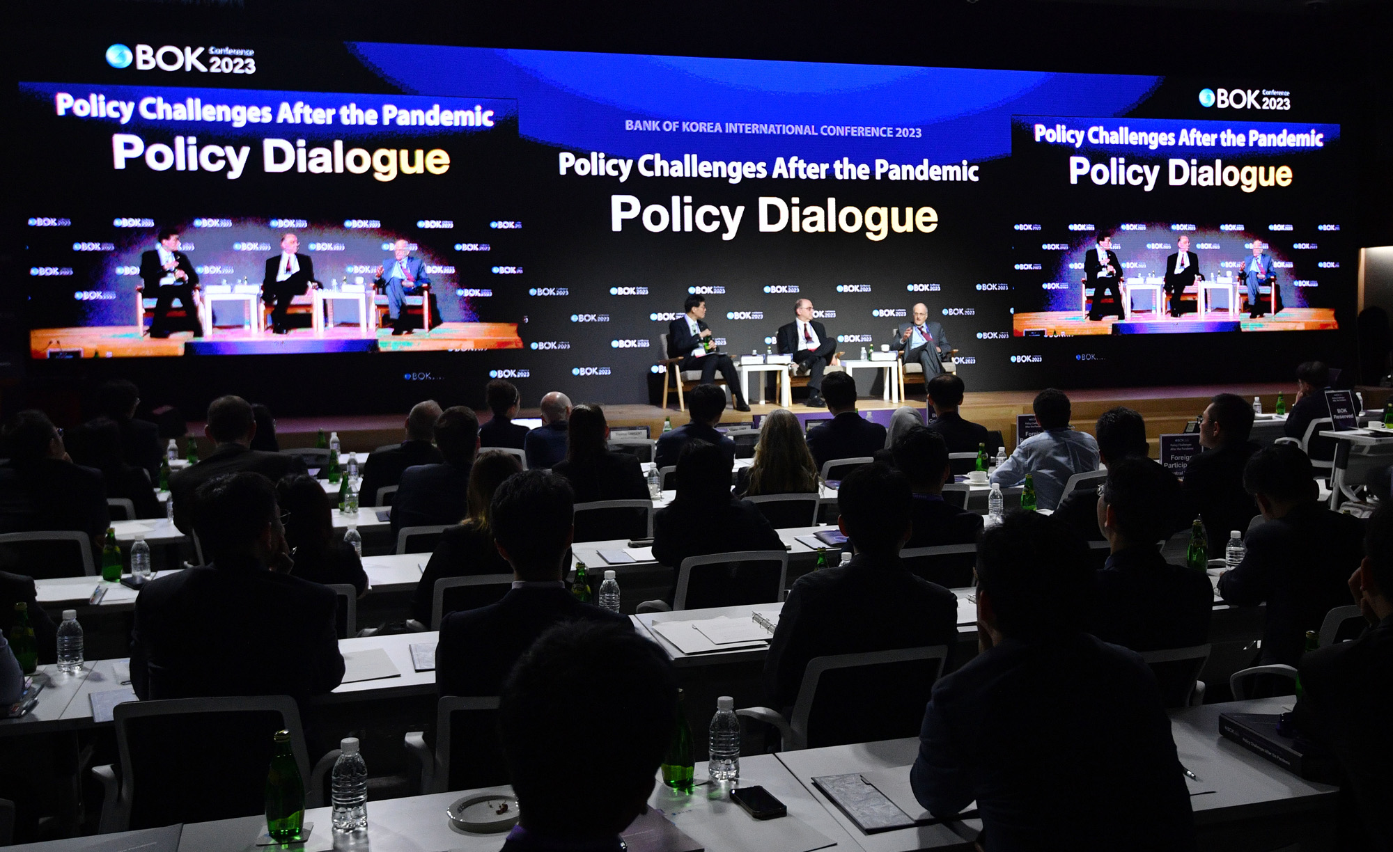 | 사진설명 | 이창용 한국은행 총재가 1일 오전 서울 중구 한국은행 별관에서 '팬데믹 이후의 정책과제(Policy Challenges After the Pandemic)'라는 주제로 열린 2023년 BOK 국제컨퍼런스에 참석해 정책 대담을 하고 있다. 왼쪽부터 이창용 한국은행 총재, 나라야나 코처라코타 교수, 토마스 사전트 교수. 2023.06.01. 사진공동취재단 |