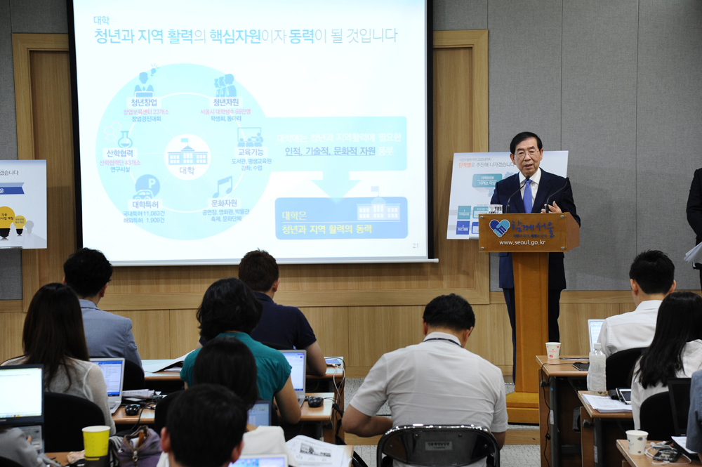 박원순 서울시장이 27일 오전 서울시청 브리핑룸에서 '창조경제 캠퍼스타운'조성계획을 발표하고 있다. 서울시 제공