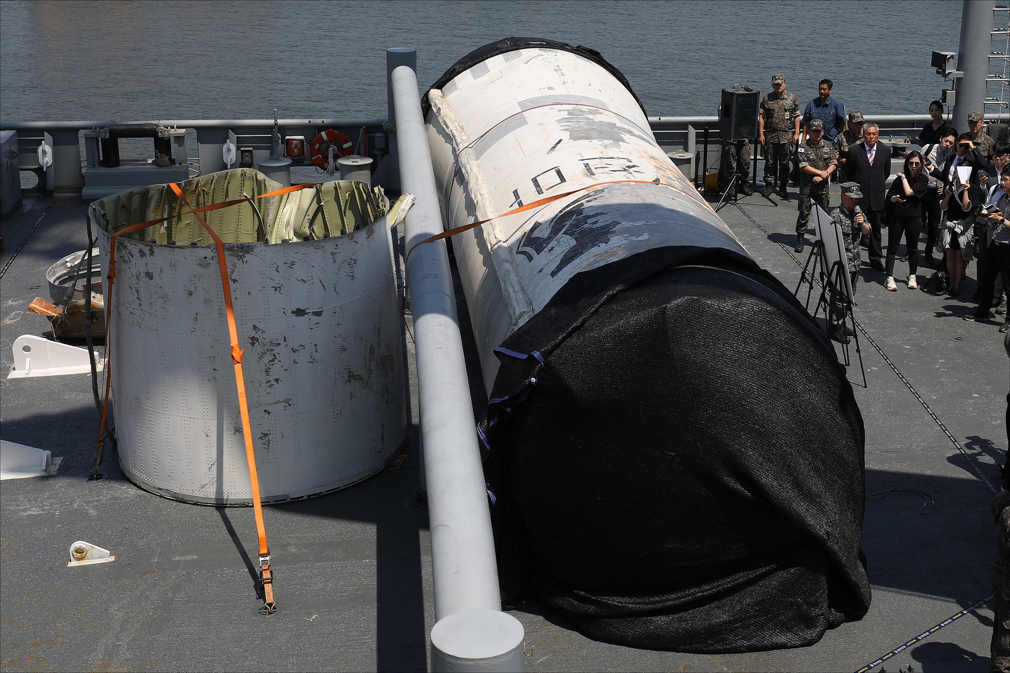 16일 오후 경기도 평택 해군 제2함대 사령부에서 인양된 북한 우주발사체가 언론에 공개되고 있다. 사진공동취재단