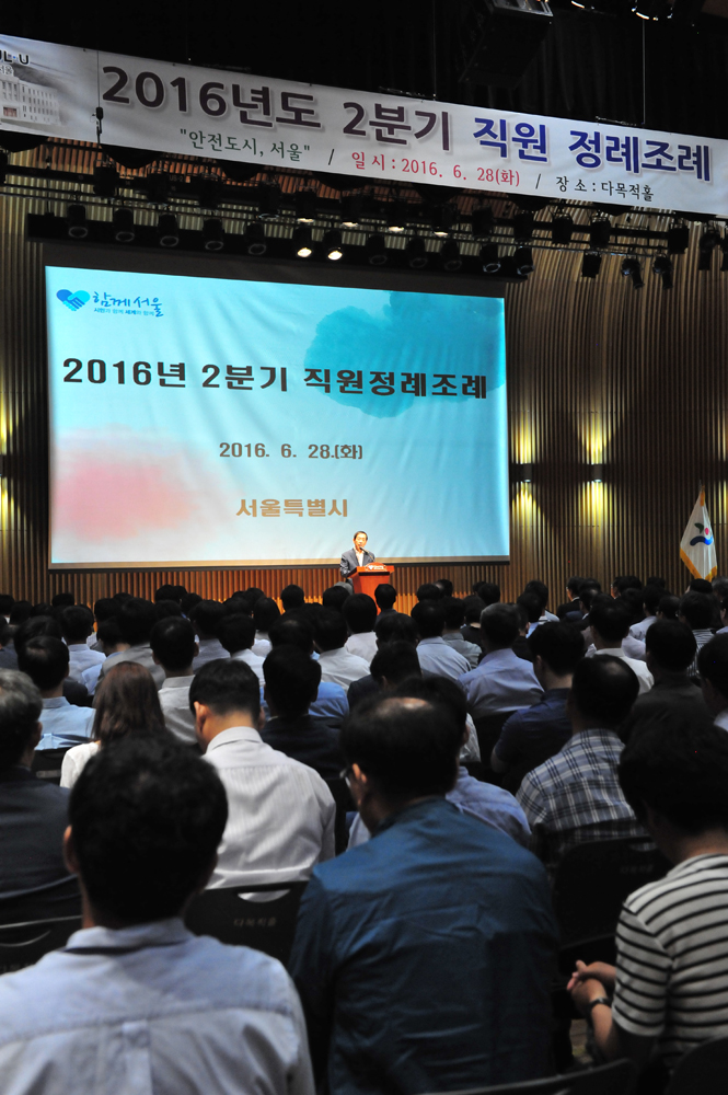 박원순 서울시장이 서울시청 8층 다목적홀에서 서울시 직원 800여명이 참여하는 올해 2분기 직원정례조례에 참석해 발언하고 있다. 서울시 제공
