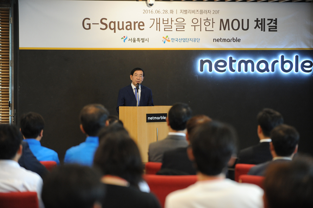 | 사진설명 | 28일 오후 서울 구로구 디지털로 지밸리비즈플라자에서 열린 'G-Square 개발을 위한 MOU 체결식'에서 참석자들이 MOU체결을 하고 있다. 한국산업단지공단(산단공)은 G밸리 신성장동력 산업 유치를 위해 G-스퀘어 설립에 넷마블을 사업자로 선정하고 1만3,000여 제곱미터(㎡)의 공원과 스포츠센터, 의료집약시설, 컨벤션센터, 산업박물관 및 게임박물관 등 다양한 시설들을 건설할 계획이다. 서울시 제공 |