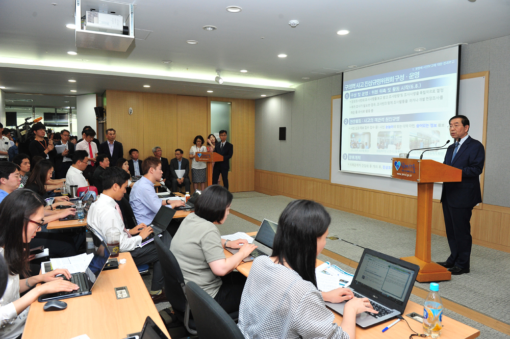박원순 서울시장이 30일 오전 서울시청 브리핑룸에서 열린 구의역 스크린도어 사고 후속대책 2차 발표 기자설명회에서 발표를 하고 있다. 서울시 제공