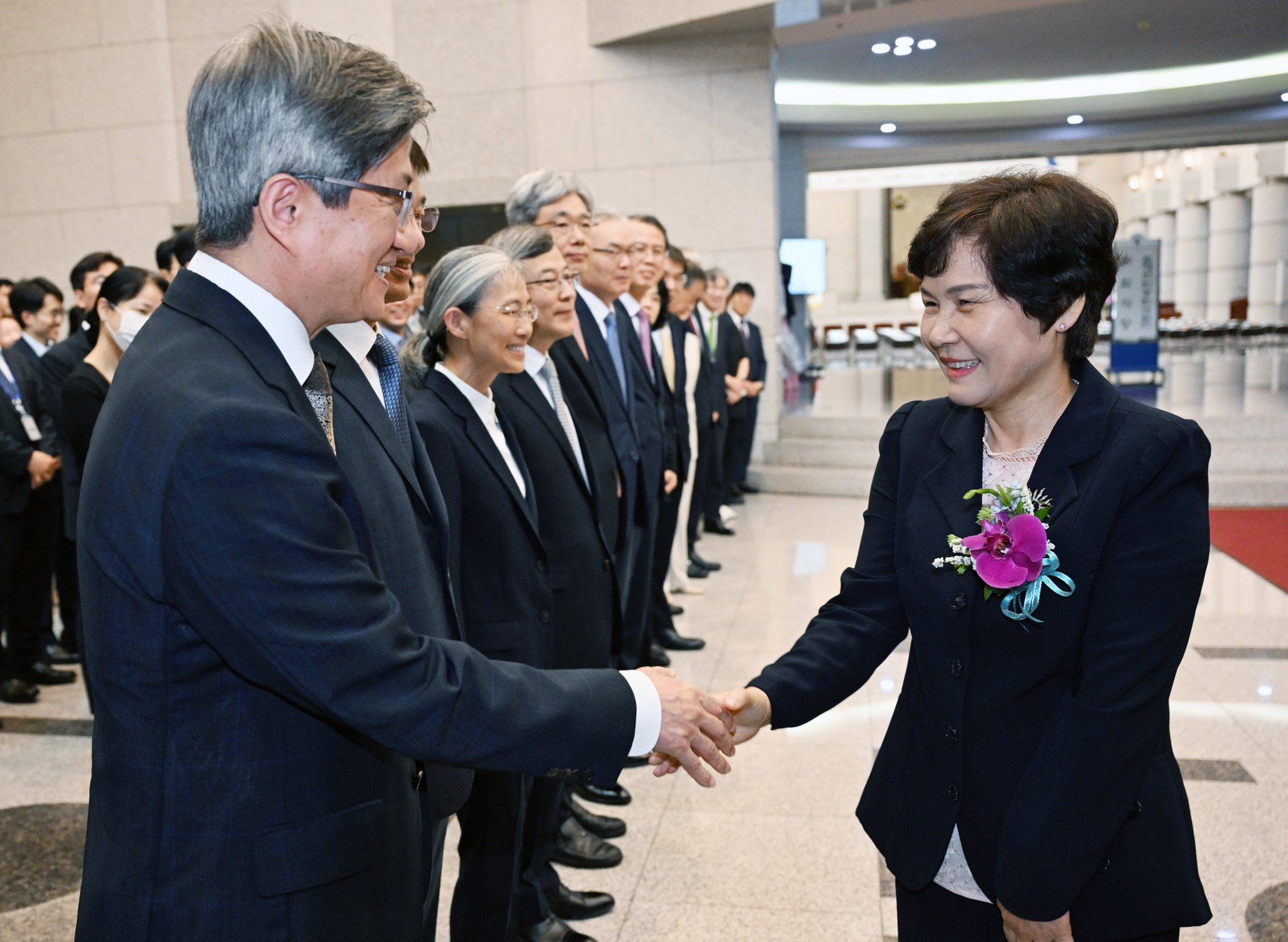 18일 오전 서울 서초동 대법원에서 열린 조재연·박정화 대법관 퇴임식에서 박정화 대법관이 김명수 대법관과 악수하고 있다. 2023.7.18.사진공동취재단