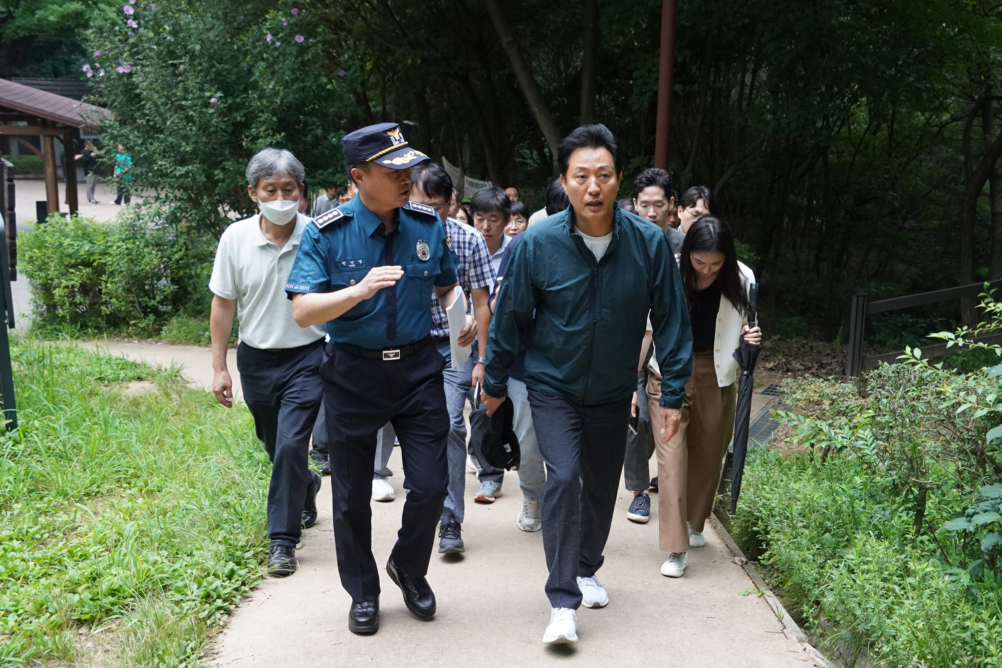 오세훈 서울시장이 18일 오후 관악산 등산로 범죄현장을 찾아 등산로 범죄예방 조치방안에 대해 보고받고 있다. 서울시 제공