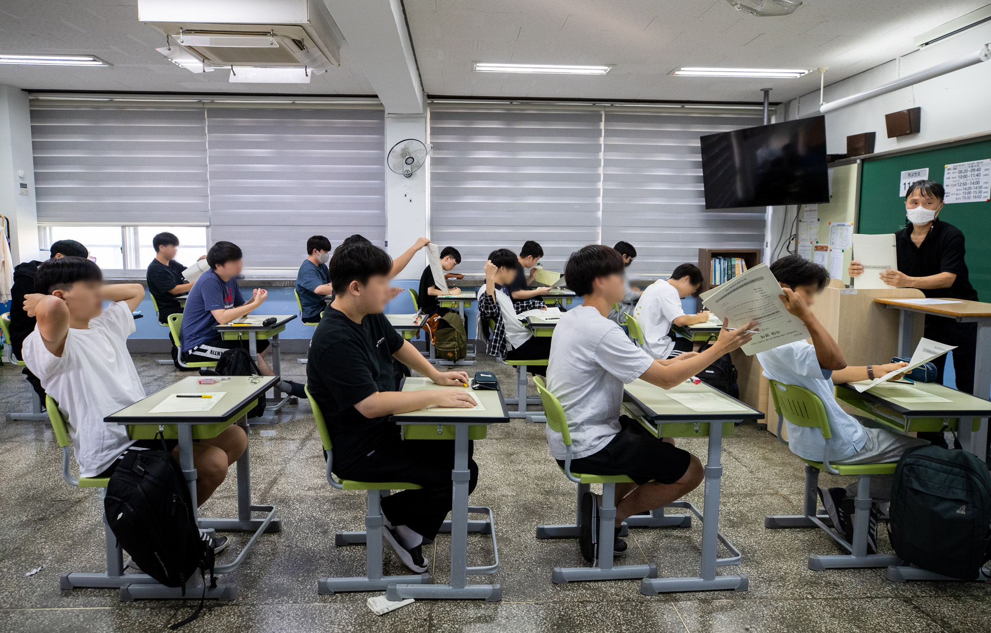 2024학년도 대학수학능력시험(11월16일) 전 마지막 모의평가가 실시된 6일 오전 서울 여의도고등학교에서 학생들이 시험지를 받고 있다.