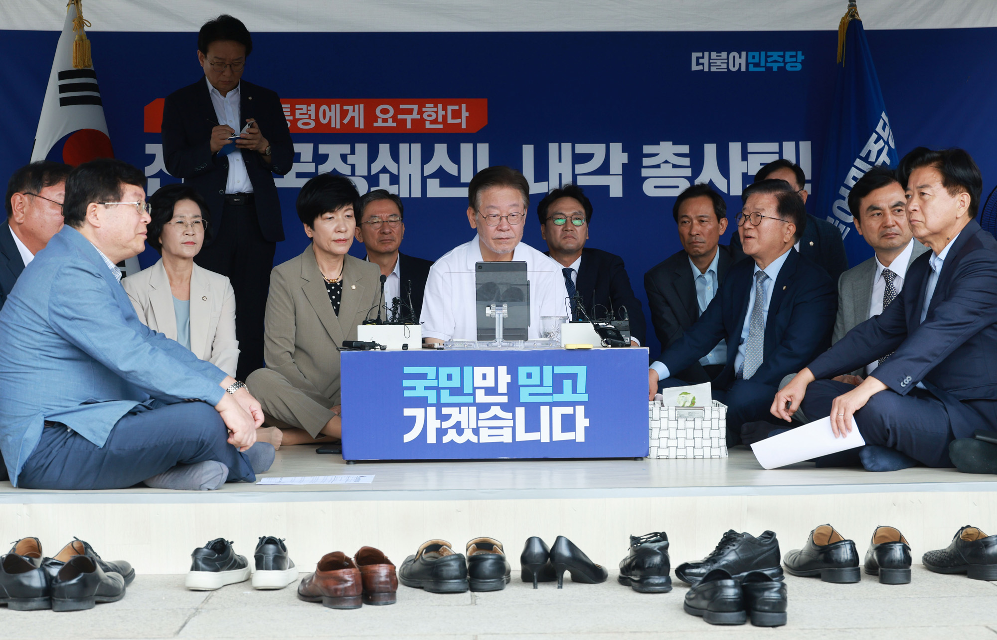 단신농성을 12일째 이어가고 있는 더불어민주당 이재명 대표가 11일 오전 국회 앞 천막에서 중진의원들과 만나 이야기를 나누고 있다. 2023.9.11
