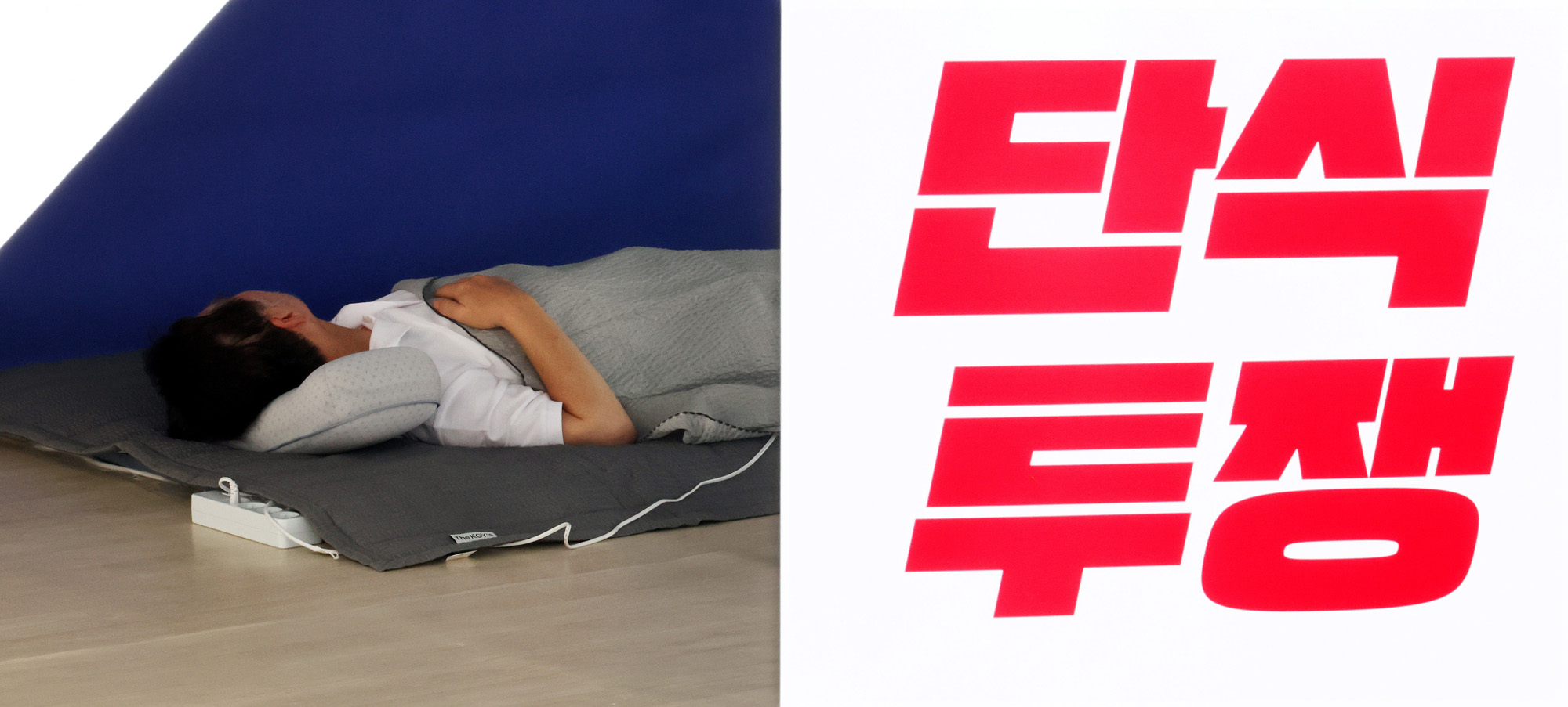 단식을 12일째 이어가고 있는 이재명 더불어민주당 대표가 11일 낮 국회 본관 앞 천막농성장에 누워있다.
