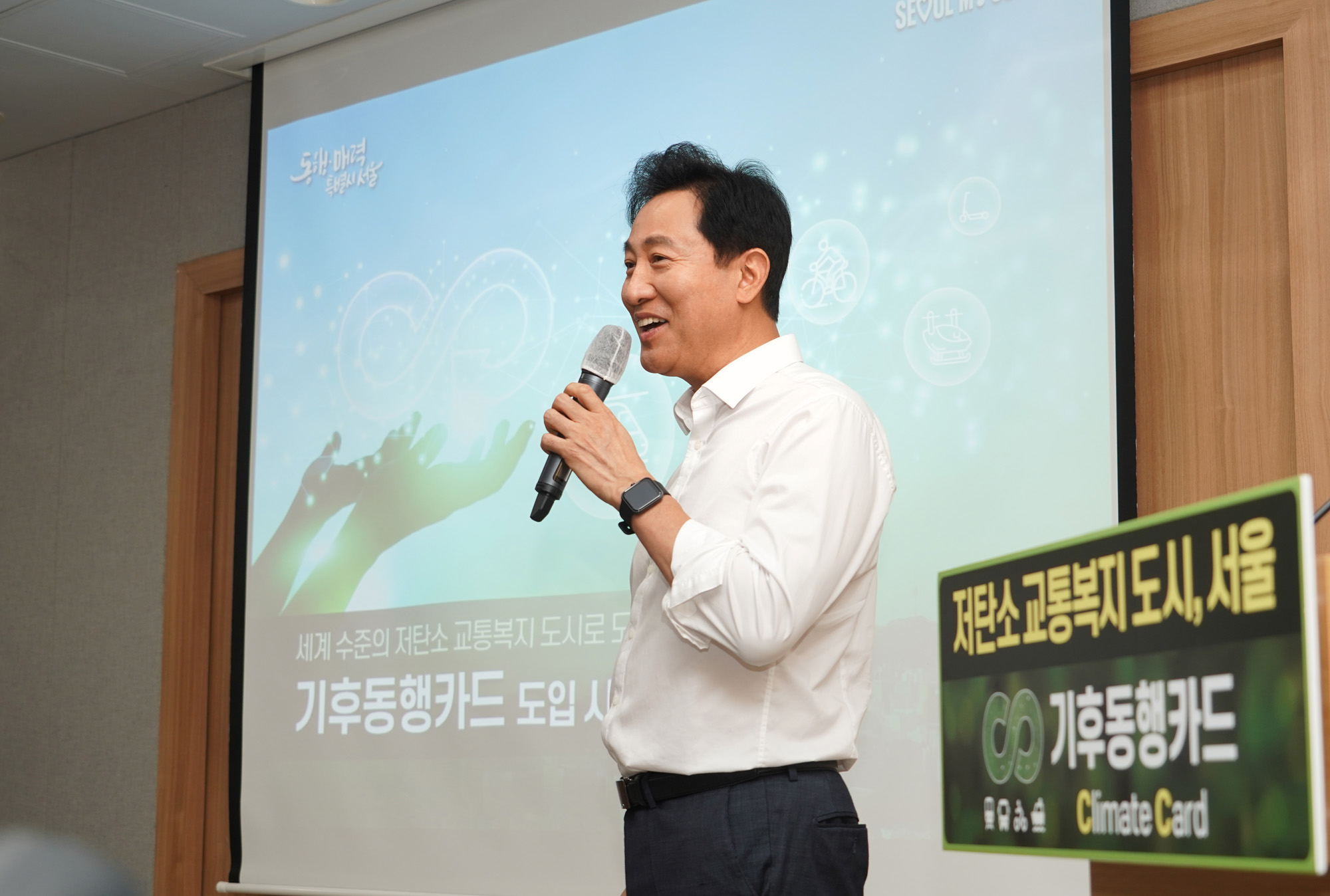 | 사진설명 | 오세훈 서울시장이 11일 오전 서울시청 브리핑룸에서 기후동행카드 도입 시행 관련 기자설명회를 하고 있다. '월 6만5000원'에 서울 시내 지하철과 시내·마을버스, 공공자전거 따릉이까지 모든 대중교통을 무제한으로 이용할 수 있는 기후동행카드(Climate Card)는 24년 1~5월 시범 판매 후 하반기부터 본격 시행할 계획이다. 서울시 제공 |