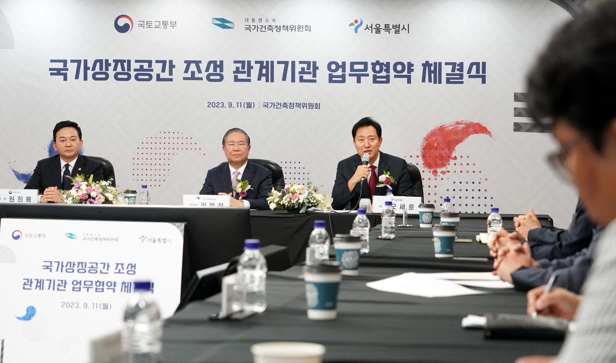 원희룡(왼쪽부터) 국토교통부 장관과, 권영걸 국가건축정책위원장, 오세훈 서울시장이 11일 오후 서울 종로구 코리안리 빌딩에서 열린 국가상징공간 조성 관계기관 업무협약식에 참석해 기념촬영을 하고 있다. 서울시 제공