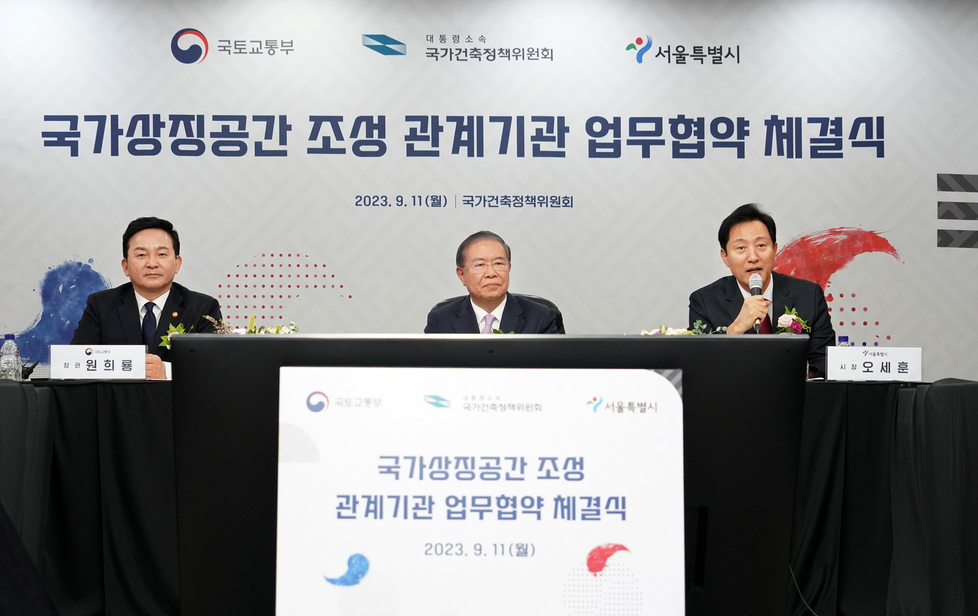 원희룡(왼쪽부터) 국토교통부 장관과, 권영걸 국가건축정책위원장, 오세훈 서울시장이 11일 오후 서울 종로구 코리안리 빌딩에서 열린 국가상징공간 조성 관계기관 업무협약식에 참석해 기념촬영을 하고 있다. 서울시 제공
