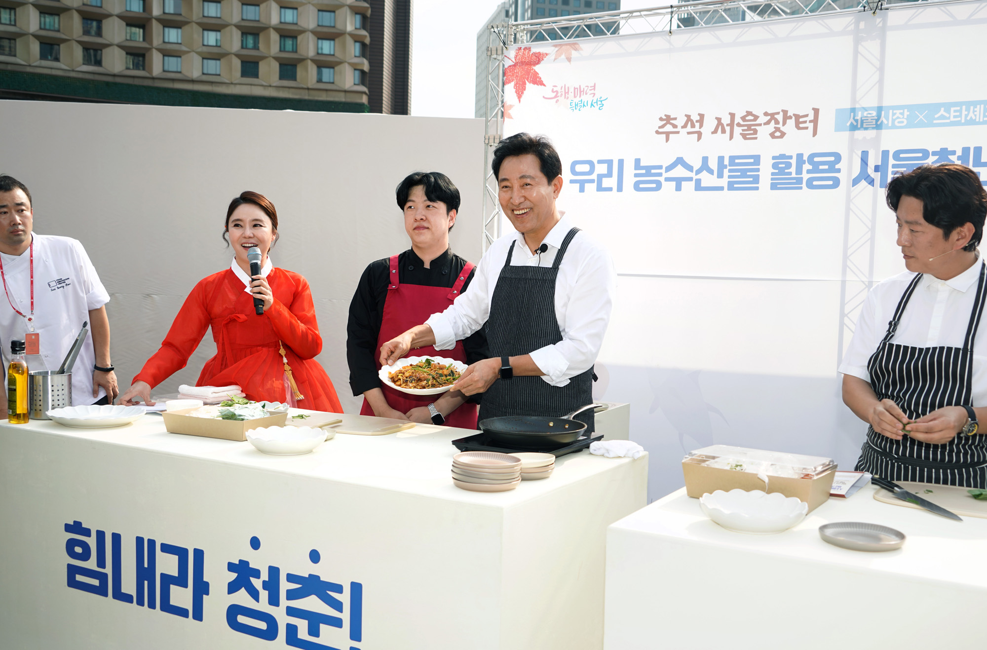 오세훈 서울시장이 11일 오후 서울광장에서 4년 만에 대면으로 열린 '추석 농수특산물 서울장터' 개막행사에 참석하고 있다. 서울시 제공