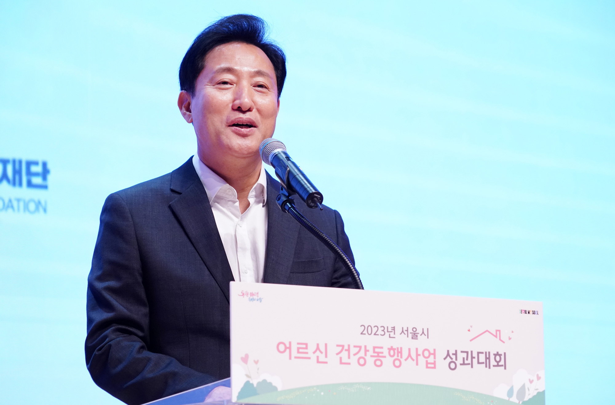 오세훈 서울시장(왼쪽 두 번째), 김현기 서울특별시의장 등 참석자들이 12일 오전 서울 중구 서울시청에서 열린 어르신 건강동행사업 성과대회에서 희망동행 퍼포먼스를 하고 있다. 서울시 제공